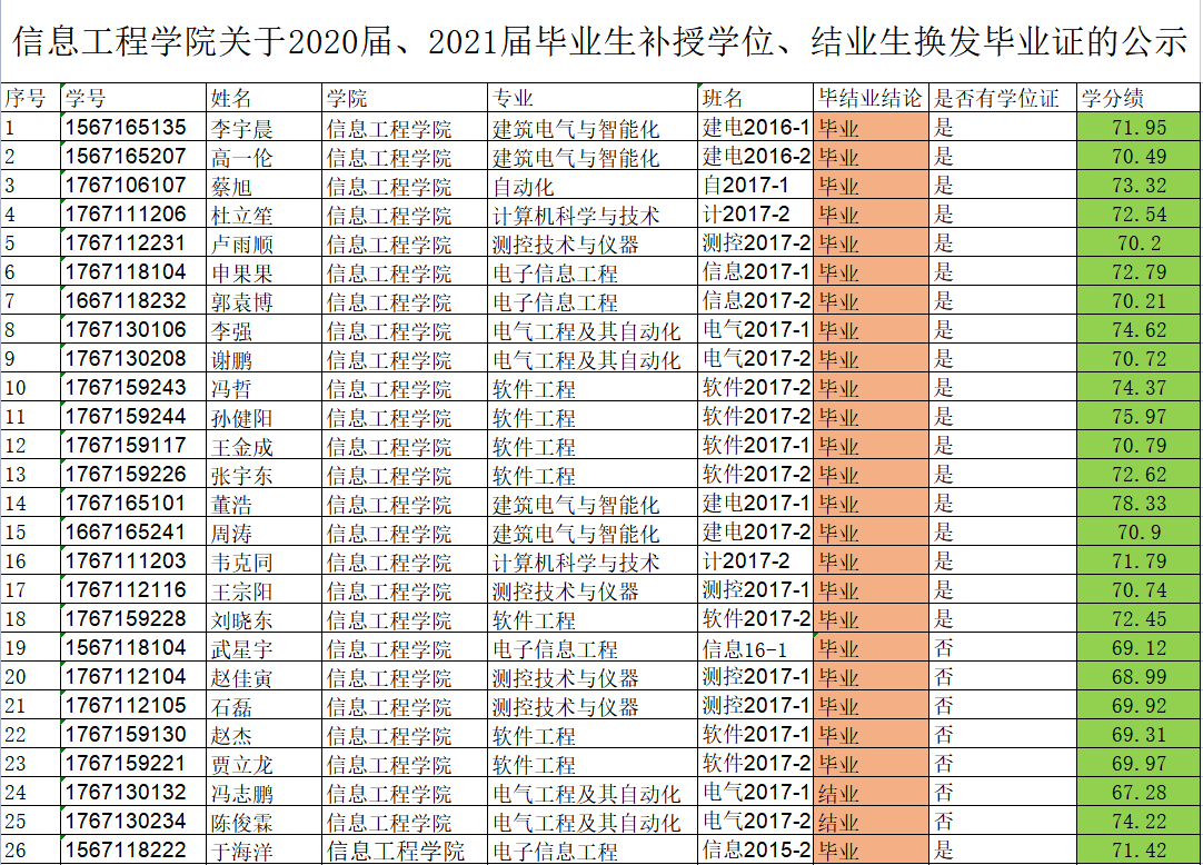 现将2020届、2021届毕业生申请补授学位、结业生换发毕业证结果进行公示。如有疑问请致电0472-5951563李老师,具体领证事宜稍后通知。