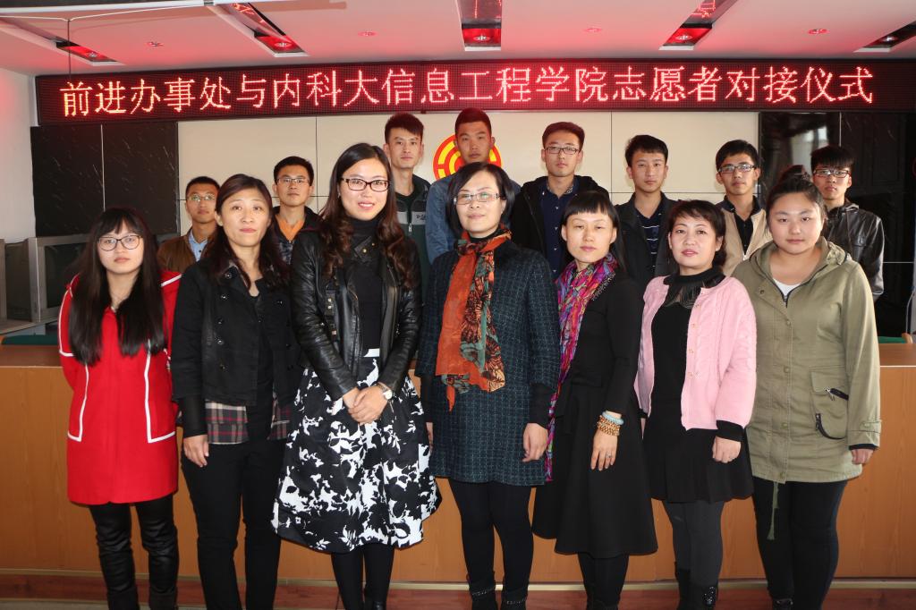 10月14日下午,古天乐太阳集团城青马班志愿者与包头市昆区前进街道办事处对接仪式在昆区前进街道办事处举行。前进办事处主任纪杰,办公室主任姚建锋,社会服务科科长刘霞以及内科大信息公司学工办龙鹤老师出席了此次对接仪式。