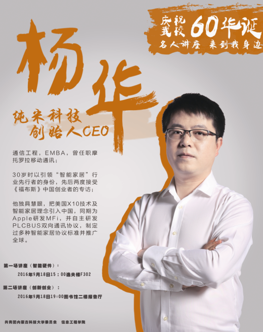 庆祝建校60周年,公司邀请杨华董事长于9月18日下午15:00和19:00,分别于逸夫楼d302和图书馆报告厅,为热爱科技创新的同学们进行了两场讲座。每场讲座都持续两个半小时,讲座内容围绕“智能硬件”和“创新创业”展开,通过理论讲述与实践经验分享,为同学们带来一场创新创业路上的精彩盛宴。杨华董事长的精彩讲座得到同学们的热烈欢迎,会场不断传出阵阵掌声。通过互动环节同学们的提问,杨董事长表示,参加讲座的同学们提出的问题有深度,对智能硬件领域有很强的求知欲,希望你们能认真学习,不断钻研,在创新创业这条路上实现自己的梦想!
