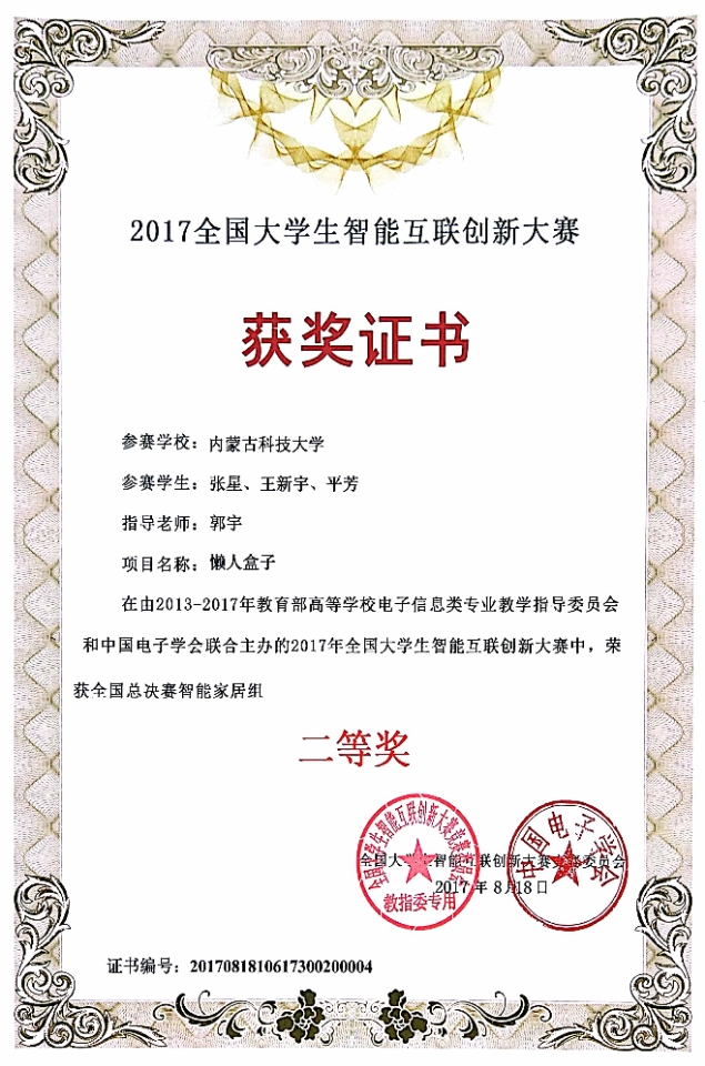 2017年8月17日至19日,由教育部高等公司电子信息类专业教学指导委员会和中国电子学会联合主办第二届“全国老员工智能互联创新大赛”全国总决赛在重庆邮电大学举行。来自包括公司、哈尔滨工业大学、电子科技大学、北京邮电大学等近200所高校的967支队伍参加比赛。公司员工张星、平芳与机械工程公司员工王新宇共同完成的项目“懒人盒子”在本次大赛中获全国二等奖。同时,公司臧琛瀚、刘存凯、翟天坤等同学分别完成的三个项目获得华北赛区二等奖,颜蒙蒙等同学完成的两个项目获得华北赛区三等奖。