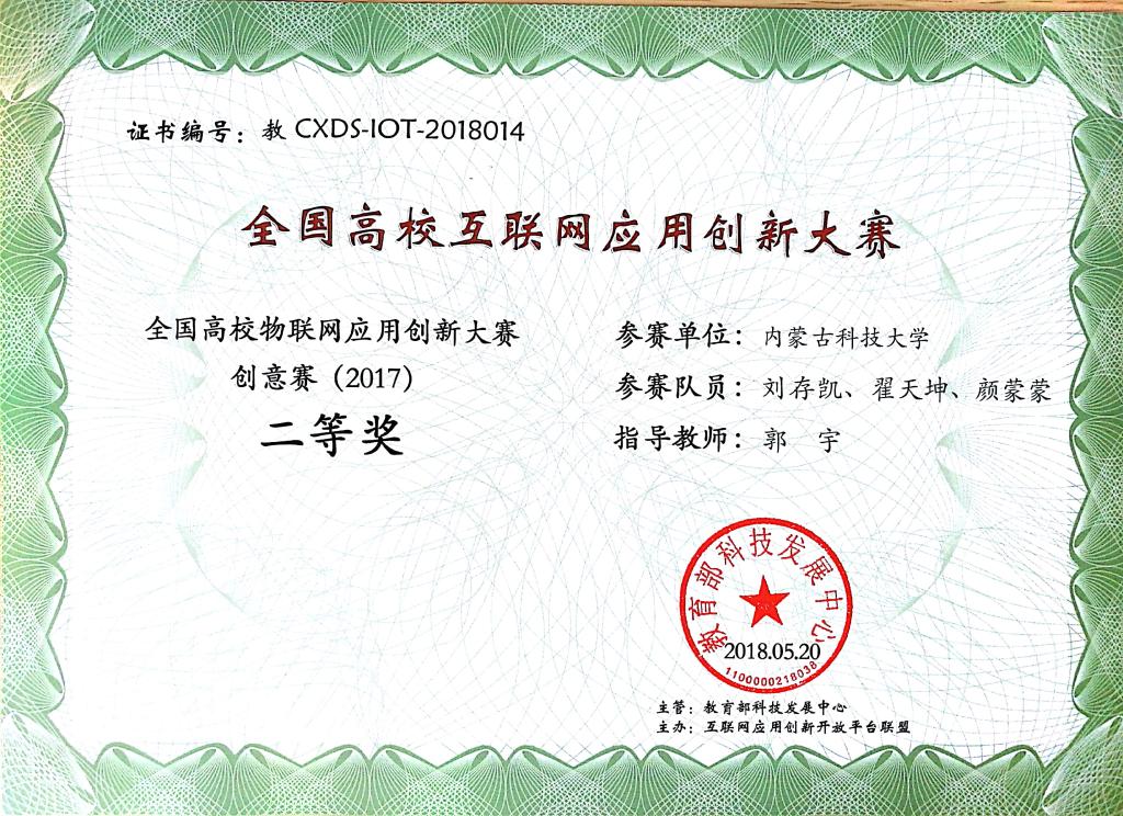 5月17至20日,由教育部科技发展中心主办,清华大学软件公司承办第五届全国高校物联网应用创新大赛总决赛在苏州市职业大学举行。经过互联网的初赛选拔和六大赛区决赛晋级,来自包括公司、南京大学、浙江大学、厦门大学、武汉大学、北京邮电大学等近百所高校的125支队伍参加了总决赛。公司信息公司教师郭宇指导、员工刘存凯、颜蒙蒙、翟天坤组成的参赛队荣获全国二等奖。在此前的华北赛区决赛中,公司信息公司的员工刘存凯、颜蒙蒙、翟天坤获得赛区一等奖。