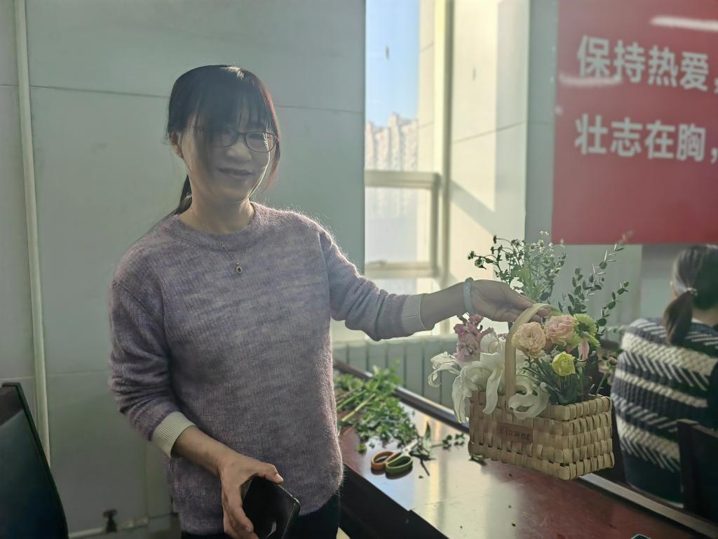 活动中,公司聘请花艺师举办花艺讲座,介绍花卉基本知识,搭配技巧,花艺师带领每位女教师自主选择喜欢的花卉进行插花,完成后带走自己的作品留念。
