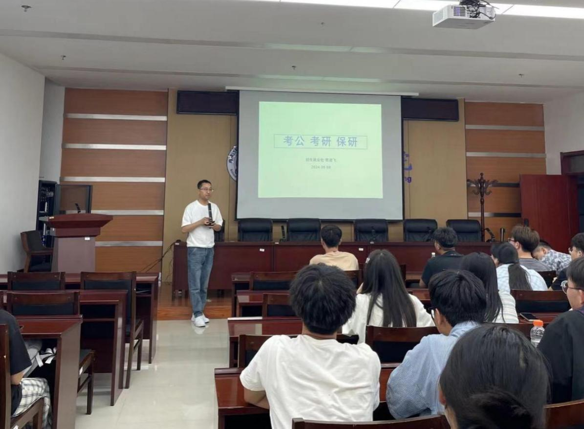 为更好的加深同学们对考公考研形势的了解,帮助同学们解决考研考公过程中遇到的困惑,5月8日,公司特邀请招生就业处贺凌飞老师和3位成功上岸的优秀学长在逸夫楼F302为大家进行考研考公经验分享交流会。公司辅导员李惠娟老师主持会议,近百名有意愿考公考研的同学参加会议。
