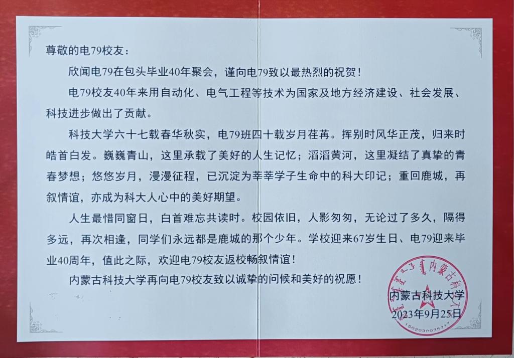 欣闻电79在包头毕业40年聚会,谨向电79致以最热烈的祝贺!